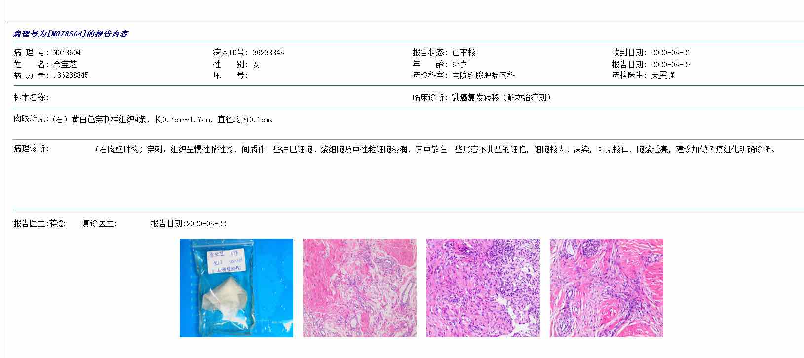 妈妈乳腺癌术后一年三个月了 ,原全切的位置长了个肿物,上周做了穿刺 说是慢性脓性炎 能麻烦哪位帮忙看看结果 是复发转移了吗?心情好忐忑啊 今天下午要带她去医院做免疫组化