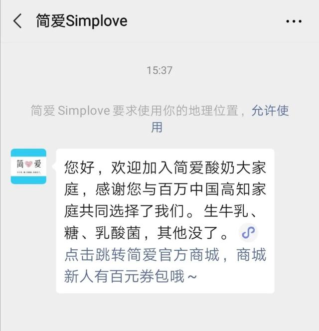 正如其所说,简爱公众号“简爱Simplove”关注语设置的便是“感谢您与100万中国高知家庭共同选择了我们。”