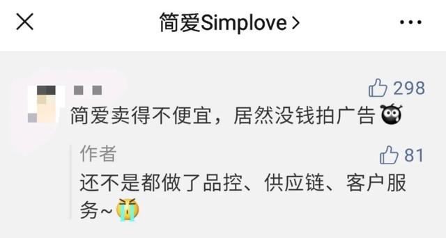 上月,简爱公众号“简爱Simplove”称发布了五年来的第一支广告,在评论区与网友互动时称“没钱做广告是因为都做了品控、供应链、客户服务”。