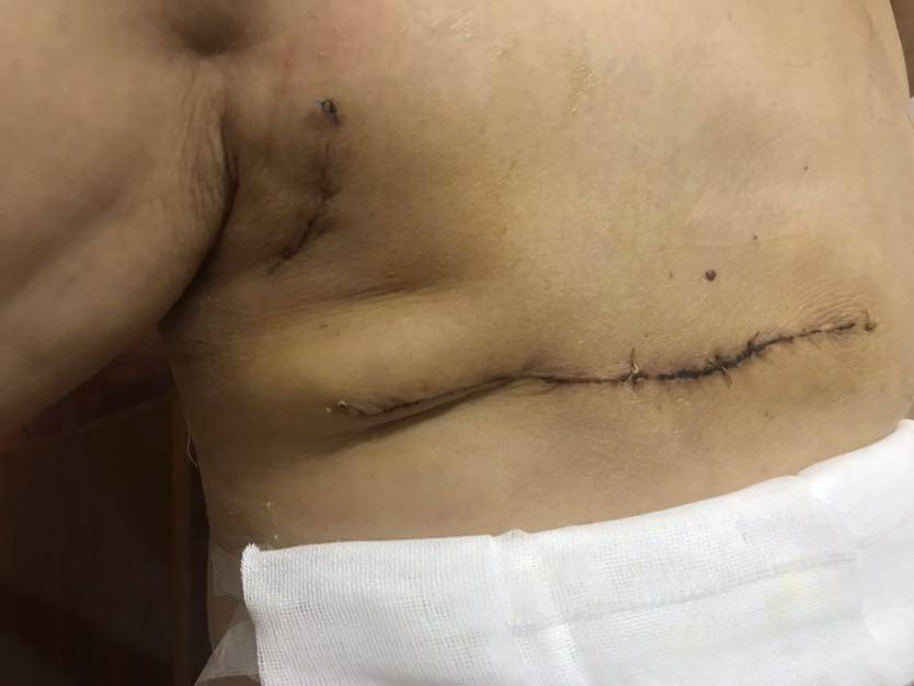 又来请教各位大神,今天是我妈妈手术的第10天,我刚刚给他换药。我看伤口都恢复挺好,但是靠近腋窝旁边那条缝合线上当有一块硬疙瘩,感觉有5×3的大小。如图。