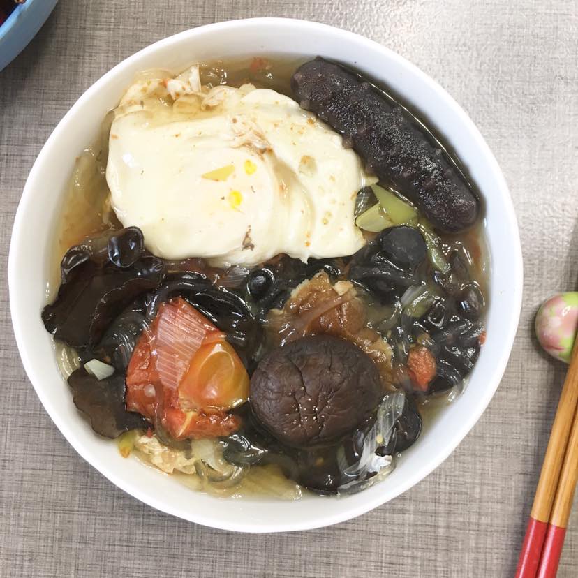今日早餐:木耳香菇西红柿🍅荷包蛋🥚青椒薯粉汤