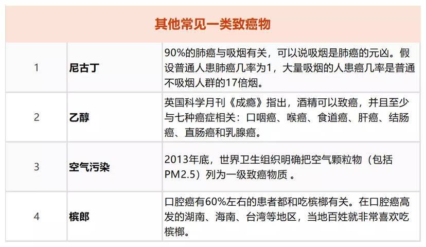 黄曲霉素、甲醛、尼古丁、亚硝胺(前体物质是亚硝酸盐,即亚硝酸盐在特定条件下才转化成亚硝胺)、苯并芘、槟榔、酒精等。