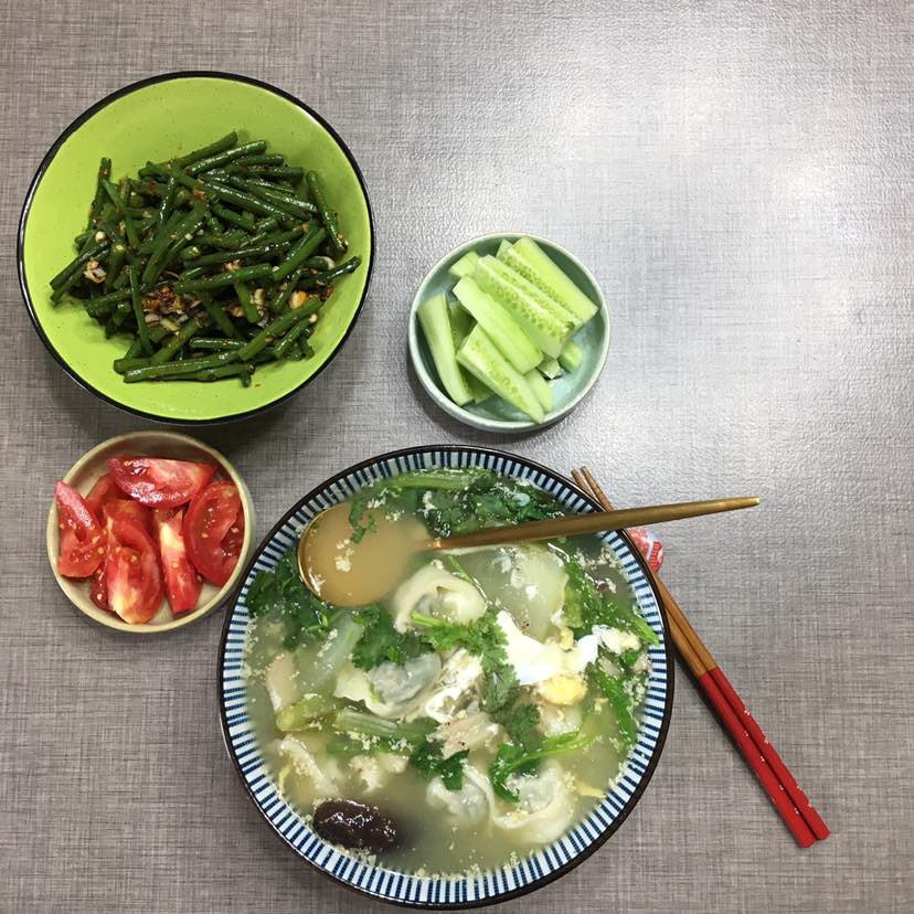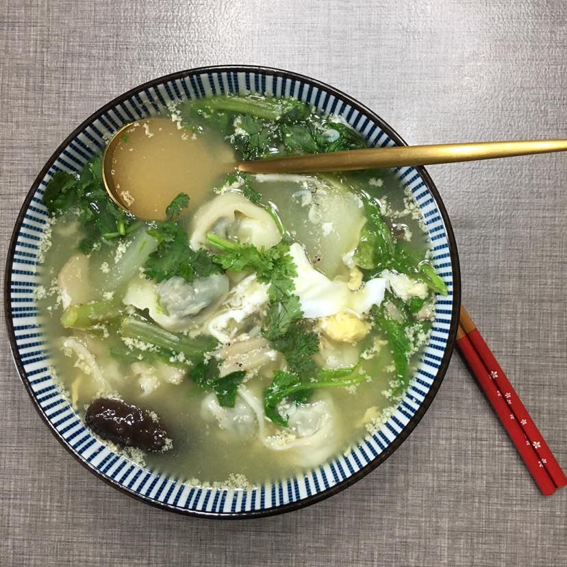 早餐:青菜、冬瓜、香菜、荷包蛋、鲜肉馄炖😄一碗馄炖5种食材,补充蛋白质、维生素和碳水化合物都有啦,馄炖是哥们包好,放冰箱冷冻的,想吃的时候随吃随取很方便,馄炖汤汁是无油的。