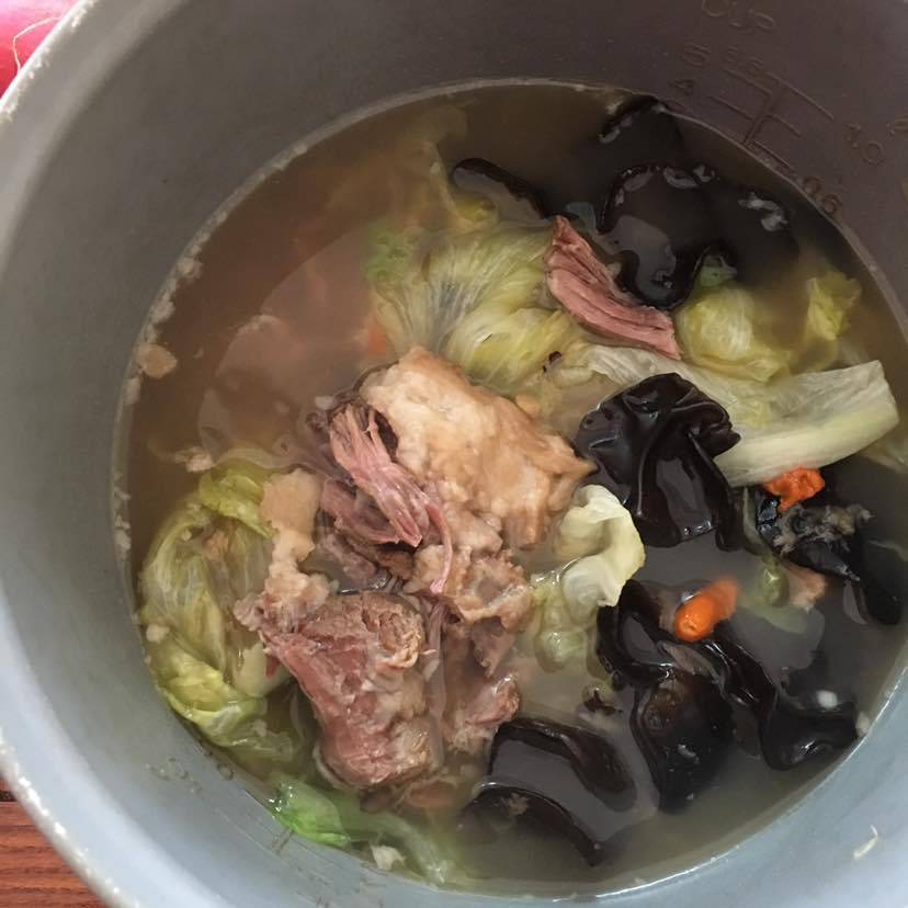 昨天煲好的牛尾汤,放在冰箱里冷藏一夜后,早起把上面凝固后的油倒掉,这样就不会担心血脂和转氨酶升高的问题了,动物脂肪也很少很少啦。午餐:牛尾生菜黑木耳汤,把牛尾汤带公司来,放点生菜和在家泡发好的黑木耳,方便快捷又有营养,不错的选择😄有时候不吃牛尾我还有点馋哈哈,化疗期间吃牛尾,都把哥们吓一跳,说我胃口真是好,没办法😢俺就是肉食动物。结束治疗后的我,在饮食方面还是收敛很多呵呵😄