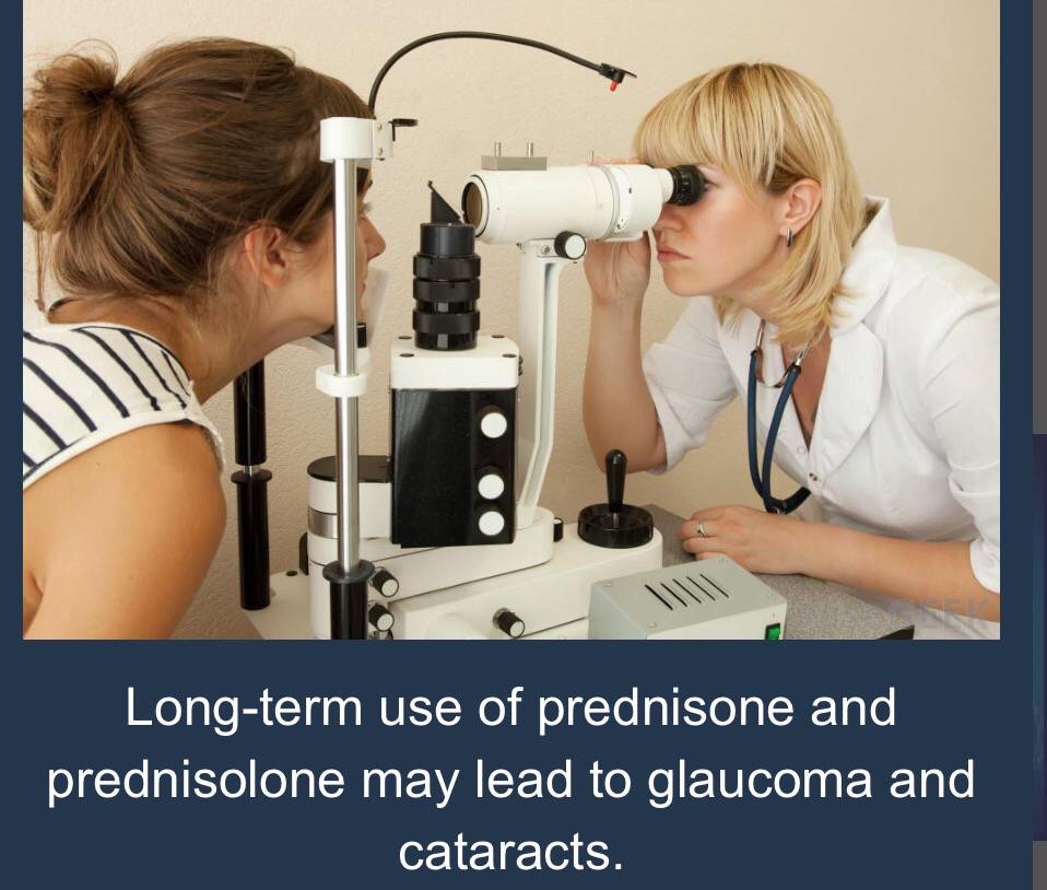 Prednisone and prednisolone have similar side effects as well. When used over the long term, they can cause such problems as Cushing’s syndrome, a disease that involves the adrenal glands; fluid retention; osteoporosis; glaucoma; cataracts; type 2 diabetes mellitu; and even depression when dosage is reduced or stopped altogether. There are numerous short-term side effects as well, such as insomnia; increased blood glucose levels, especially in people who have diabetes mellitus; decreased or blurred vision; increased thirst; cataract formation; confusion; and other psychological problems.