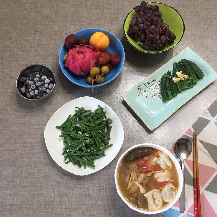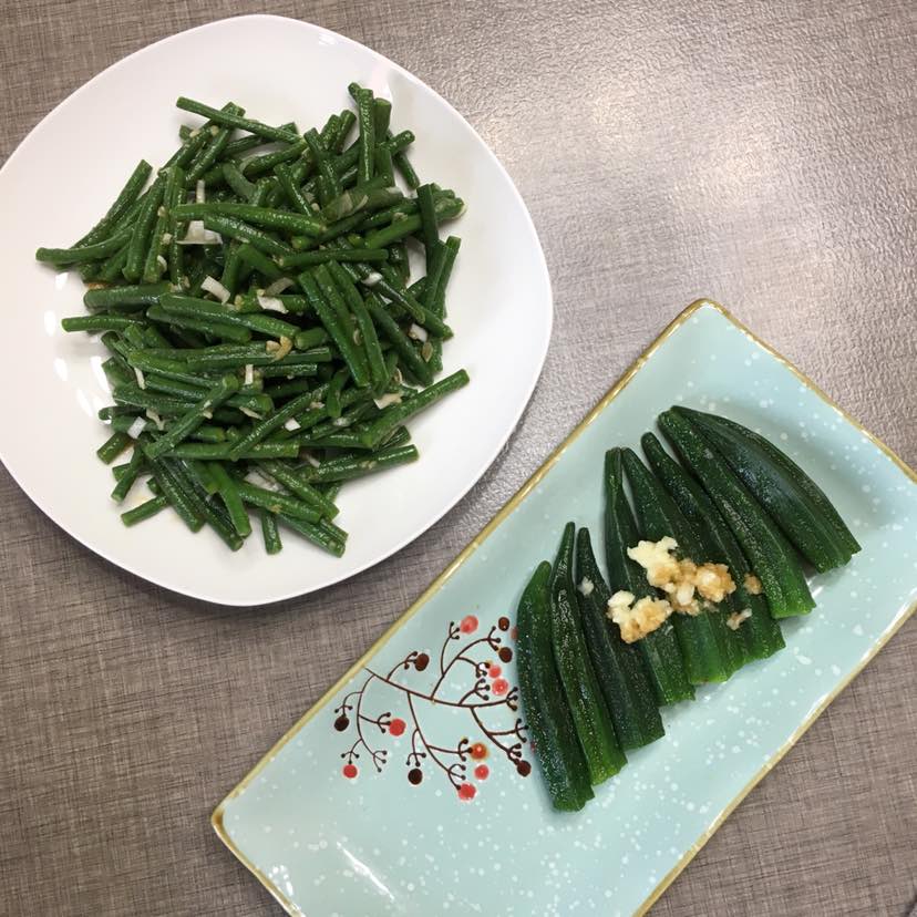 蒜蓉缸豆角和白灼秋葵,现在的季节蔬菜种类繁多,吃水煮菜热量低,而且烹饪方法简单。