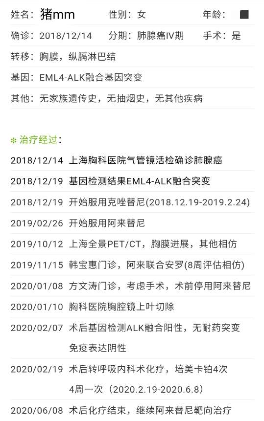 1.确诊腺癌晚期ALK,首选靶向,体感良好,无2级以上不良反应,主要不良反应:乏力,咳嗽,心理压力大和经济毒性。
