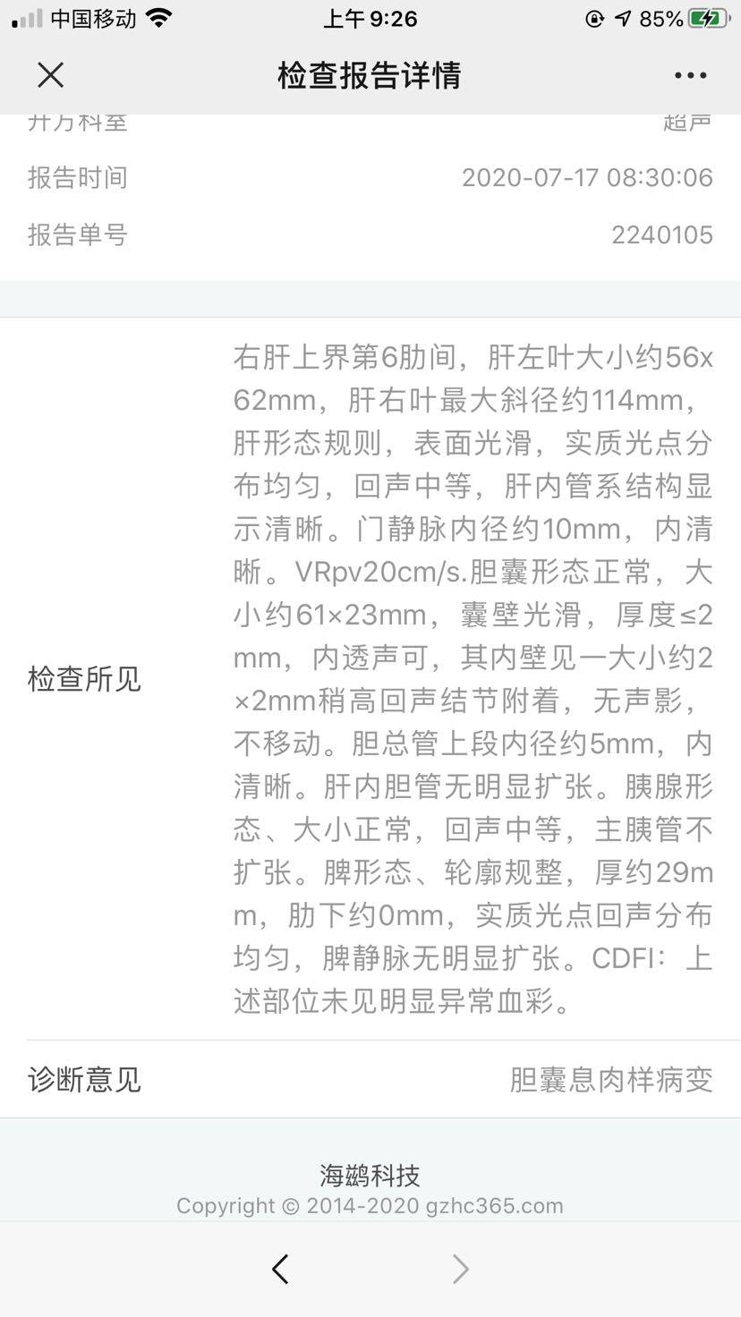 今天大清早就去医院复查,经过忐忑-紧张-小担心-放松的过程,结果很快出来了,其他结果都很好,只是这次发现了胆囊息肉2*2mm(之前一直没有)内心又不淡定了,4月因卵巢囊肿进行了去势腹腔镜手术,好怕又要手术,我就像是惊弓之鸟,赶紧跑步找到医生,医生说没什么大问题,定期复查就好了……