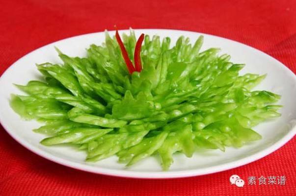 2、将苦瓜条加辣椒丝和精盐后,控出水分,然后放凉开水中浸凉捞出,放人酱油、豆瓣酱和熟油拌匀即可。