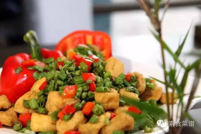 4、油倒出,把油豆腐和彩椒粒放进锅里,翻炒,再加入炸好的豆角和油豆腐,腰果酱和生抽搅匀放入,再翻炒。再加半勺水,闷烧2分钟左右。(TIPS:油豆腐需要用铲子摁压,这样才能入味,也更鲜嫩。)