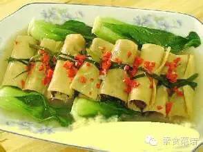 3、上海青去叶留心,下开水灼一下,摆盘。用花生油、盐、味精、湿淀粉调成汁,烧开淋在豆皮上,淋点香油。