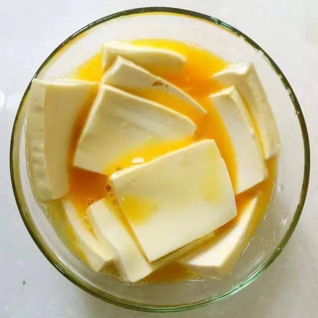 2、将豆腐片放入蛋液里稍微腌制使