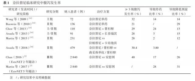 在HER2阳性乳腺癌的治疗中,使用含靶向HER2小分子药物的方案,腹泻发生均较常见。奈拉替尼的Ⅰ、Ⅱ和Ⅲ期临床研究中报道的(未进行预防治疗)腹泻发生率为21%~40%(表1)。