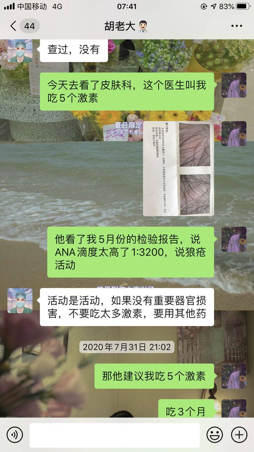昨天去看了广西医科大附属一院的皮肤科,医生说我ANA滴度1:3200太高了,狼疮一直都在活动,所以我的头发没长,然后建议我加激素,配合他开的药吃几个月,然后两个月后就会长出头发。我昨晚就问了一下我之前看的主治医生,问他要不要加激素,他意思好像不要我加,那到底加还是不加,我本来是吃一个激素的,烦死人了。