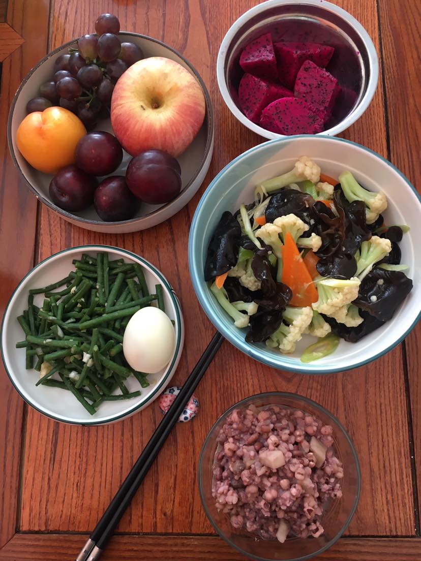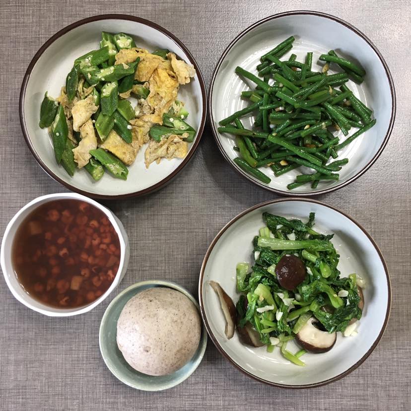 早餐:薏米红豆芡实茯苓粥/秋葵炒蛋/拌缸豆角/香菇炒油菜/杂面馒头