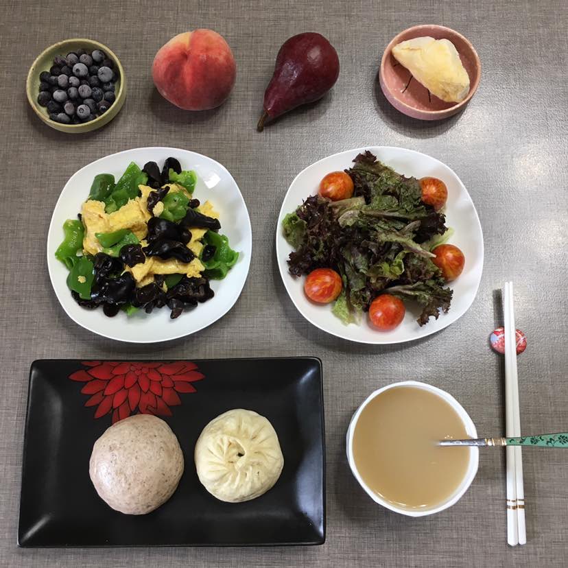 青椒木耳炒土鸡蛋/西红柿小生菜/杂面馒头和荠菜猪肉包子