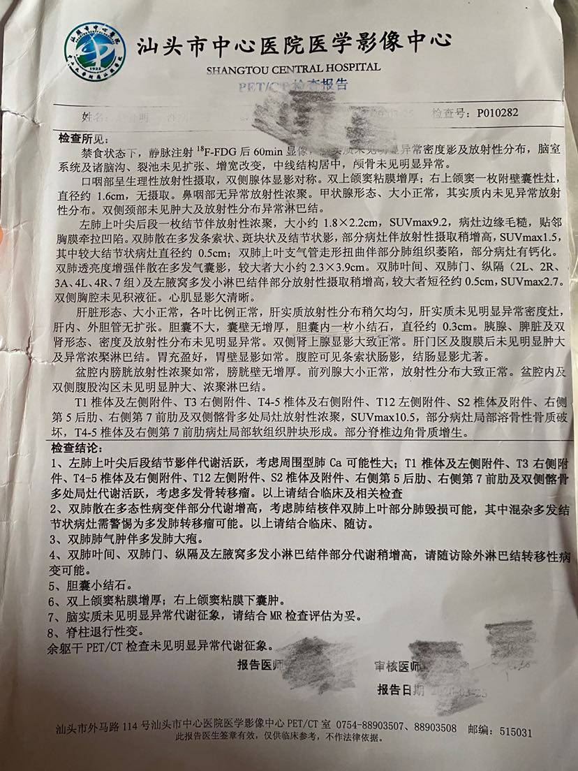 妈妈患肺癌已经有三年了,这三年来一直在接受治疗到现在,下面是妈妈检查以及治疗的过程。2010年10月,妈妈体检出肺癌IV期,纵隔淋巴转移,肝部转移,去省肿瘤医院复查,做了PET-CT,结果一样,省肿瘤