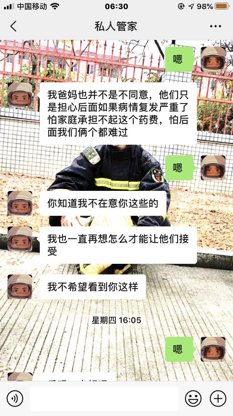 一定要坚持,我是2018年确诊的,2019遇到对我好的男孩,一直到现在,他爸爸也很照顾我,最近发生的就是,股骨头坏死,我哭着对我男朋友说怎么办,他说你生病的时候我没在你身边,现在我一定时时刻刻陪着你,他既然决定了,你就不要跟他提分手,好好生活,控制住,你以后的生活会很美好的