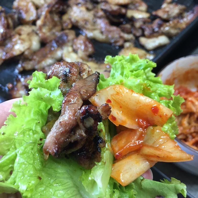 猪五花用韩国烤肉酱腌制一下,烤的时候搭配烤肉蘸酱和辣白菜,然后包在生菜里吃绝对爽😄