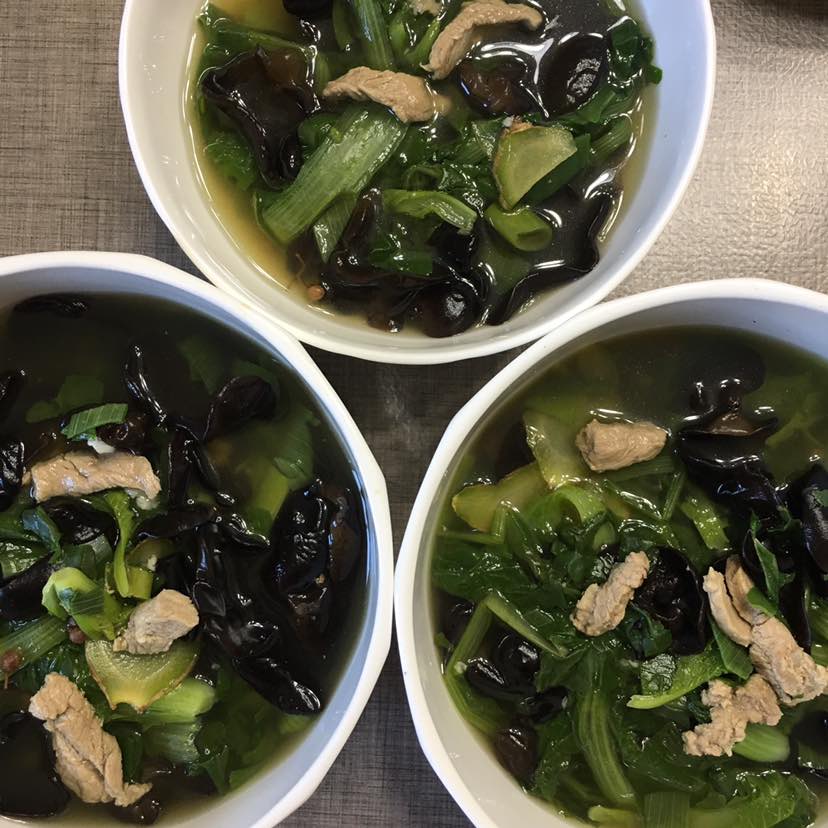 早中餐:小白菜木耳肉丝汤,无油汤。把肉丝和姜丝先煮熟,这样肉汤味道浓一些。然后加入小白菜和黑木耳。