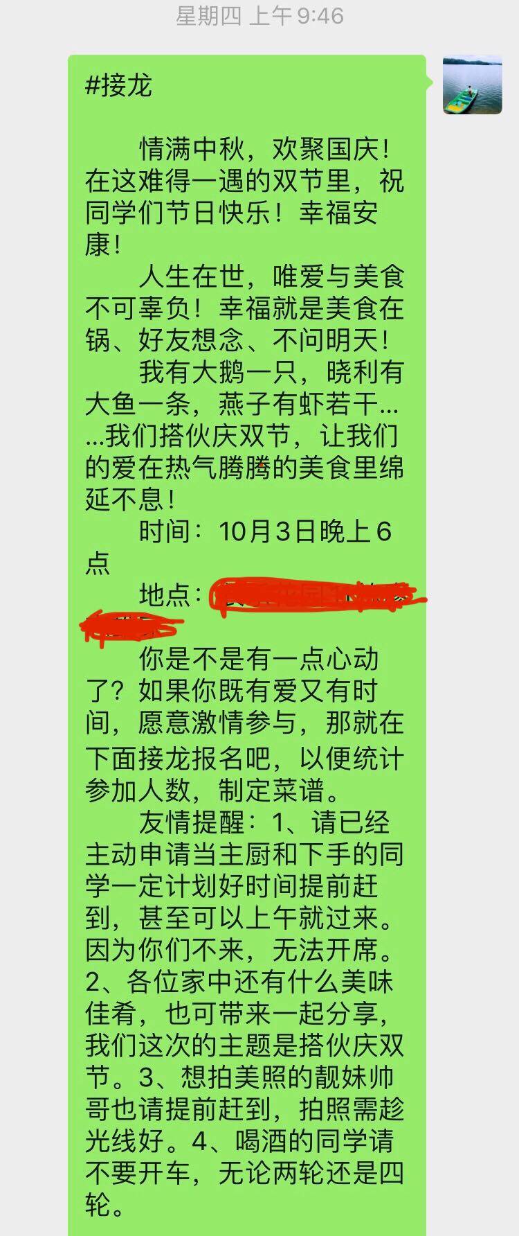 10月3日在大家的期盼中眨眼便到。天有点阴凉,但影响不了我们火热的心情。大家顾及我的身体,只需我提供场地,活儿她们全包,让我当一回真正的甩手掌柜。从入场的洗菜切菜到活动完后的清场卫生,几个女同学硬是不让我插手,她们干得热火朝天,妥妥当当,满满的感动哈!