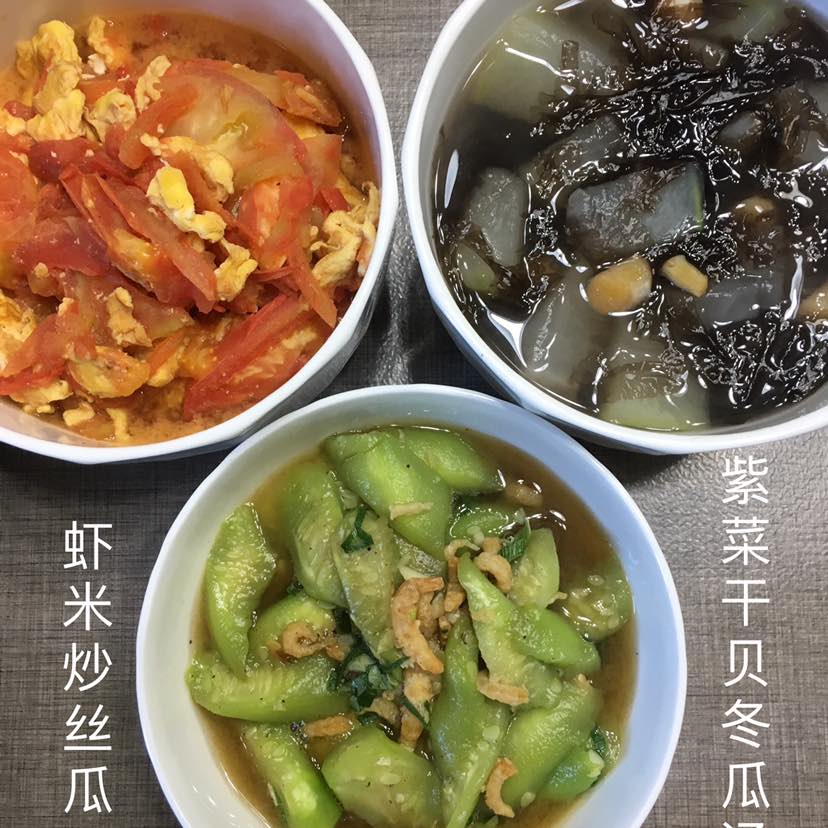 西红柿🍅炒蛋,这个属于国菜喽😄虾米炒丝瓜/紫菜干贝冬瓜汤