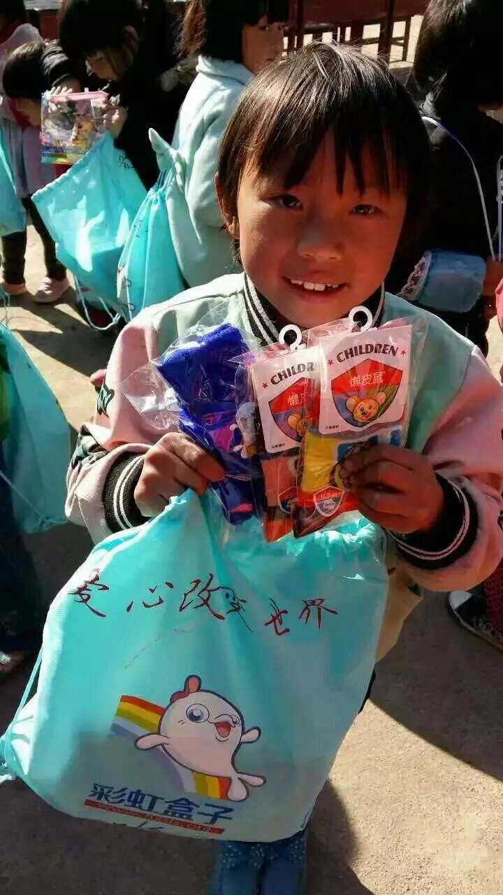 小朋友拿到滴水公益的彩虹盒子,满满的笑容,好开心!