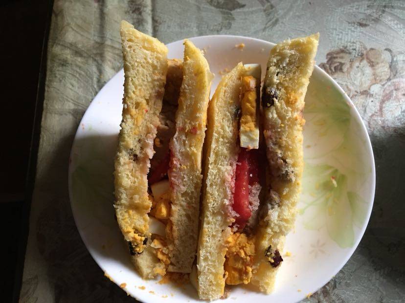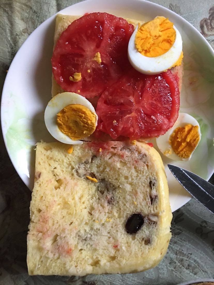 我今天的早餐,面包、鸡蛋、自制午餐肉、西红柿,还有一小碗玉米𥻗百合粥放点奶粉,昨晚自己做的面包,里面有葡萄干、蓝莓干、核桃仁碎。