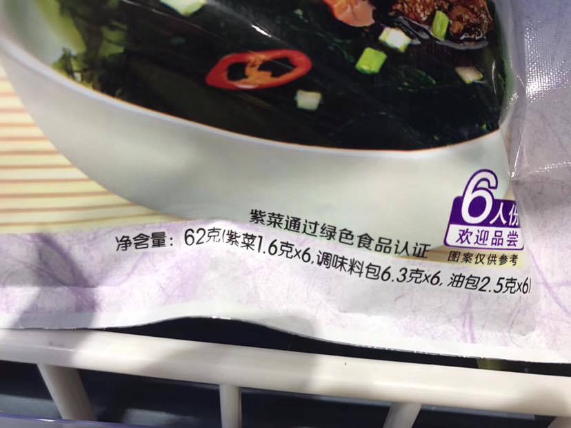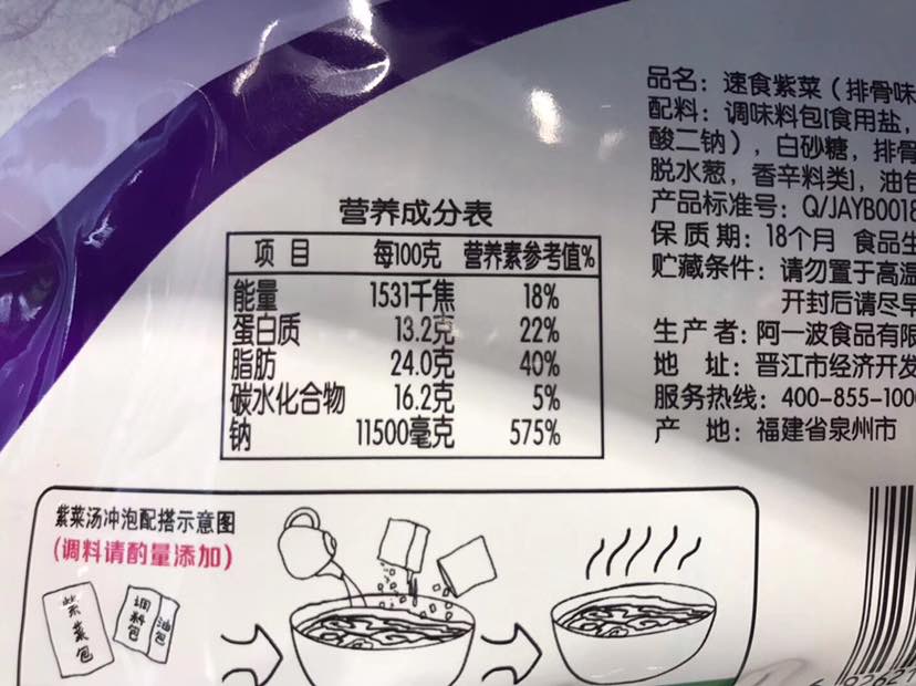 昨天逛超市,在各种品牌的紫菜汤跟前儿驻足了一会儿😂某名星代言某紫菜汤。看着成分表里的含钠量,以为自己眼花,看重影了😱摘了眼镜拿到眼跟前儿仔细瞧,没错,11500毫克/百克!🙄赶紧换算一下:紫菜1.6克,调料包6.3克,不算油包7.9克。这一碗汤,含钠908毫克,2克盐还多!吓得我赶紧放回去了…(经常吃方便面的,也可以换算一下,一包方便面下去,吃了多少盐😱400毫克钠约等于1克盐)。