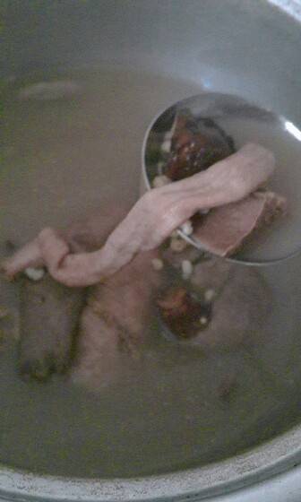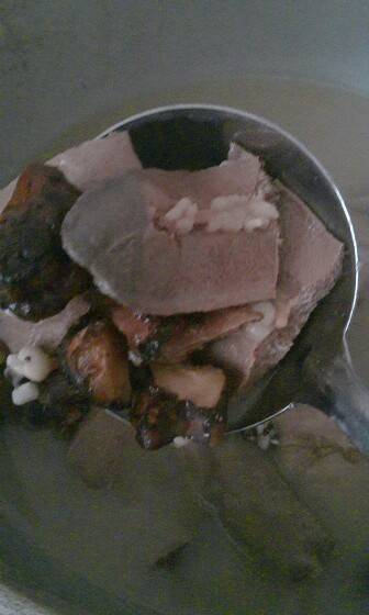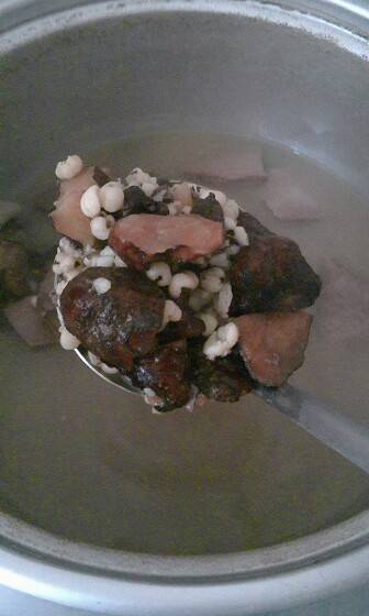 那个汤,一级棒啊,健脾胃去湿气的,新鲜的土茯苓,猪利,猪肚,猪肠,茨实,薏米,这些材料煲的,很用功,把猪内脏的东西洗干净,用开水烫一下,在捞起来,土茯苓还有茨实,薏米先放下去煲,开了后,连同食物一起放下去煲,我用的是电饭煲,所以好控制火候,一直煲大约1个钟后,看一下,翻一番,感觉那个水量差不多够喝了,就可以保暖啦。