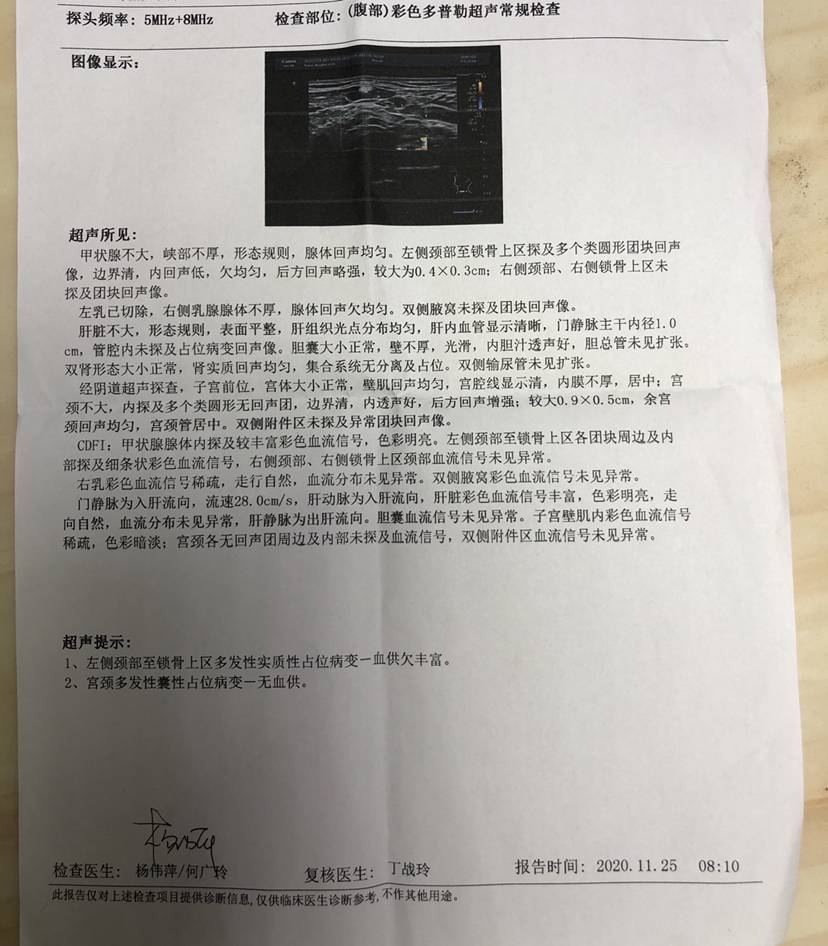 有觅友能看得懂b超检查报告吗??显示左边颈部有多发性实质性占位病变,好紧张啊。。。发信息给医生看了,几天了都还没空回复我,这会是复发吗?