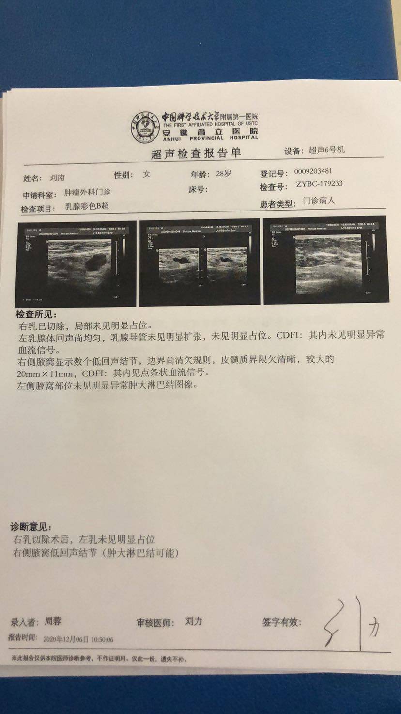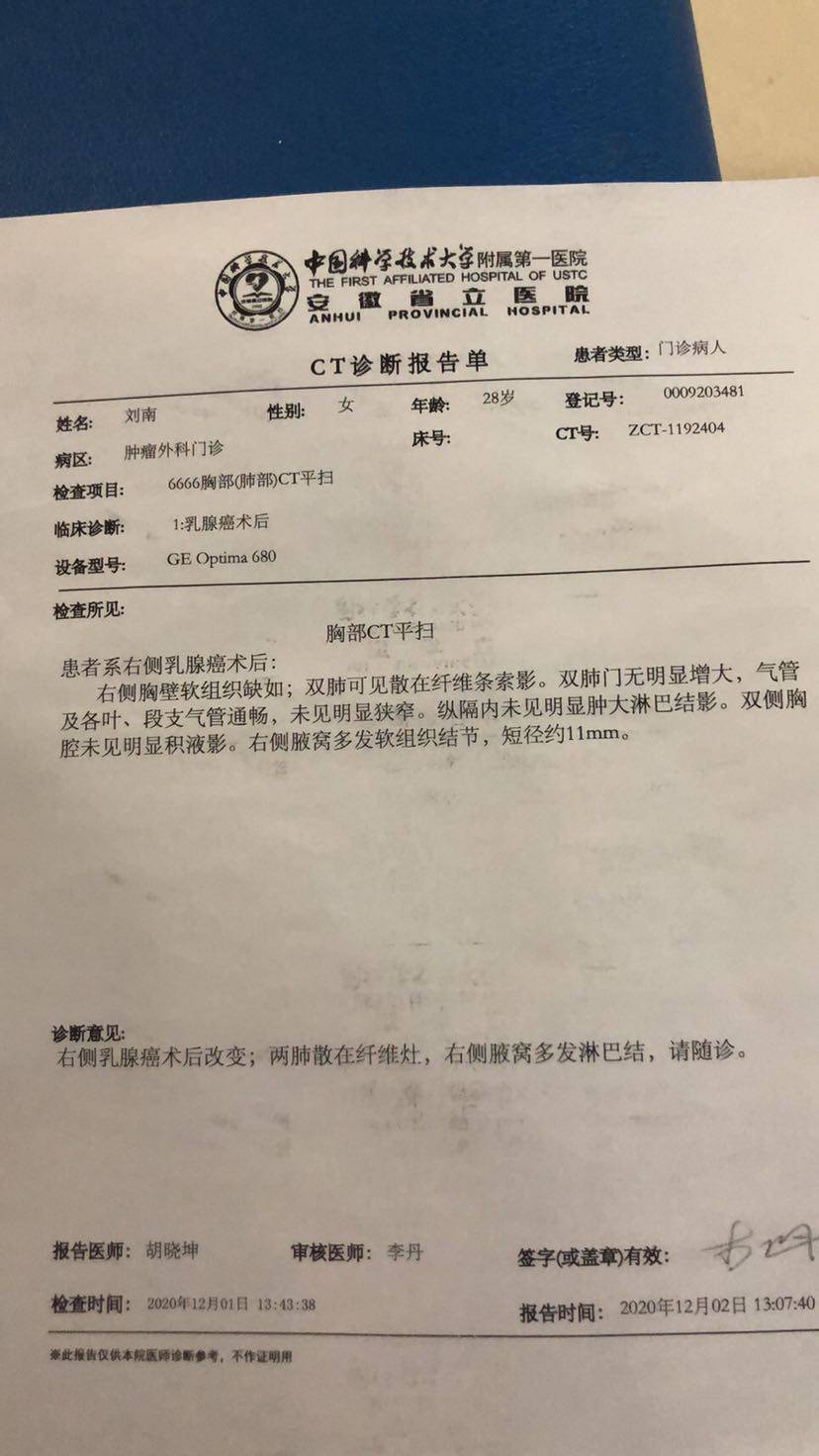 上午等到十一点左右轮到我,医生从上往下依次检查,我说做ct显示有肿大淋巴结,然后医生医生重点检查了右侧腋窝,说确实不好,我说是不是复发转移了?他说,这个不敢确定,还是跟你的医生联系,看接下来怎么办。医生边检查边说,能够看到的不好的淋巴结有四个,其他还有一个小的,当时没进行腋窝淋巴清扫,还是埋下了隐患。