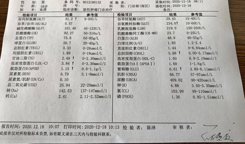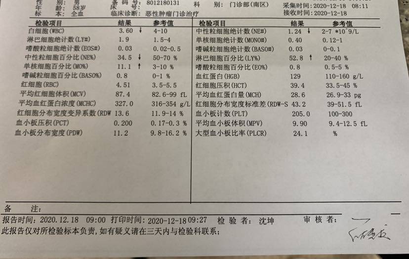 第三次化疗后出院一个星期,休整两个礼拜又要开始第四次,也就是最后一次术后辅助化疗。抽血化验结果出来,随着化疗的副作用加剧,天天五红汤+鸡蛋,牛奶也顶不住了,白细胞第一次降到参考值以下了