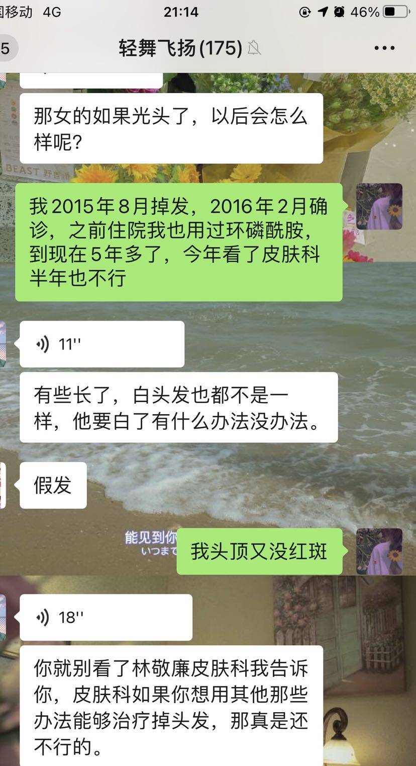 昨晚听了我们本市的风湿科主任给我们说了好多,说了去广州参加省年会的感悟,说备孕的打肝素这些什么的,其实我也听不太懂,后来我就问了一句,我说我头发怎么回事?她又给我们说了一个掉头发女孩的故事,到底是命重要还是头发重要,有的人用了环磷酰胺掉头发后又长出很黑很浓的头发,有的人就很慢很慢,而我就是慢的那种,还说对于治头发的问题,如果看皮肤科也治疗头发是不可能的,其实我听了这句真的很伤心,我确实看了半年皮肤科,但是没有明显效果。我是不是该死心了?