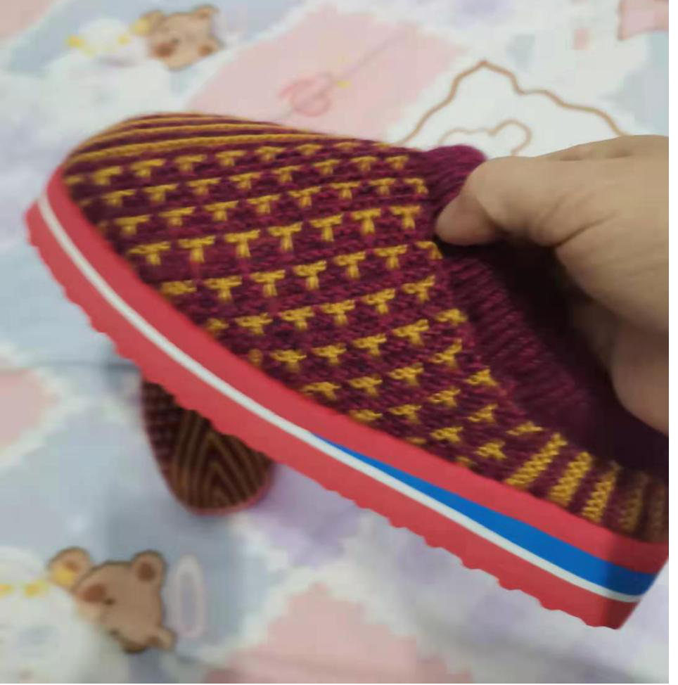 这是一款毛线海绵拖鞋,39码,材料有毛线、海绵、鞋底一双,这款鞋是从后跟起头10针,一个颜色织7个来回开始加针,开始排花,加到针上有41针的时候开始从鞋口丢针,不再加针了,第一次丢四针,以后都是每个来回丢3针,丢到鞋头剩7针左右就不丢了,在开始织另一半的鞋面,再就是没行3针的加,加到鞋口剩4针就不用加了,然后又开始排花,收针,一直收到针上还有10针就不收了,不织花了,直接织平针,织7个来回就把另一边缝合起来,然后就织鞋口,鞋口织20圈,收针,最后就用针线把鞋口往里面缝起来就好了。(你学会了吗?)