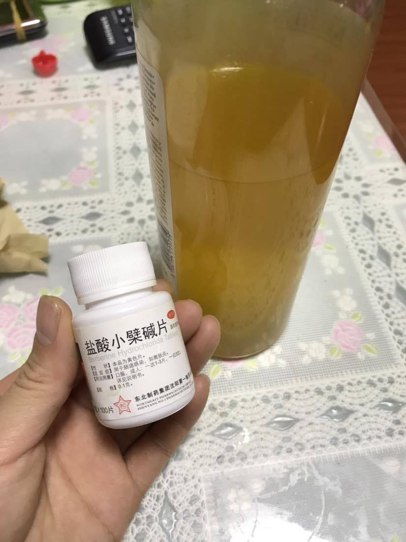 黄连素水(盐酸小檗碱)药店买来自己调,500毫升清水里放5片盐酸小檗碱就变成黄连素水啦。