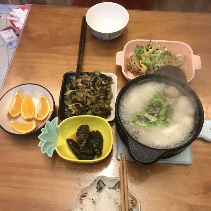 晚上没客人,给他做了份煎饺,一锅筒骨萝卜汤,一盘小炒咸菜,给自己盛了碗剩饭。