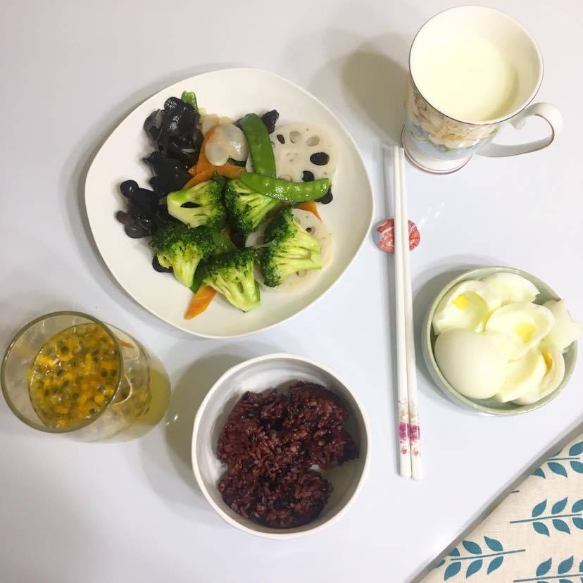 今天的早餐我一个人,老王上班。杂粮饭,白水煮蛋,橄榄油拌西兰花黑木耳🥕杏鲍菇,一杯奶一杯百香果水。健康营养哈😄