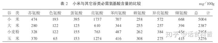 相比其他谷物来说,小米的营养成分含量丰富,下面两个表格分别对小米和其他谷物的营养成分与必需氨基酸含量进行比较。