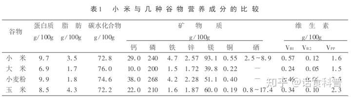 小米中的碳水化合物含量与其他谷物相差不多,但小米中含有较多的纤维素,是大米的2.5倍,纤维素虽不能被人体消化吸收,却是人体内不可缺少的碳水化合物。此外,小米中的矿物质如锌、镁、硒等含量也较为丰富。而且维生素作为维持机体正常生命活动所必需的营养素,其含量明显高于其他谷物。