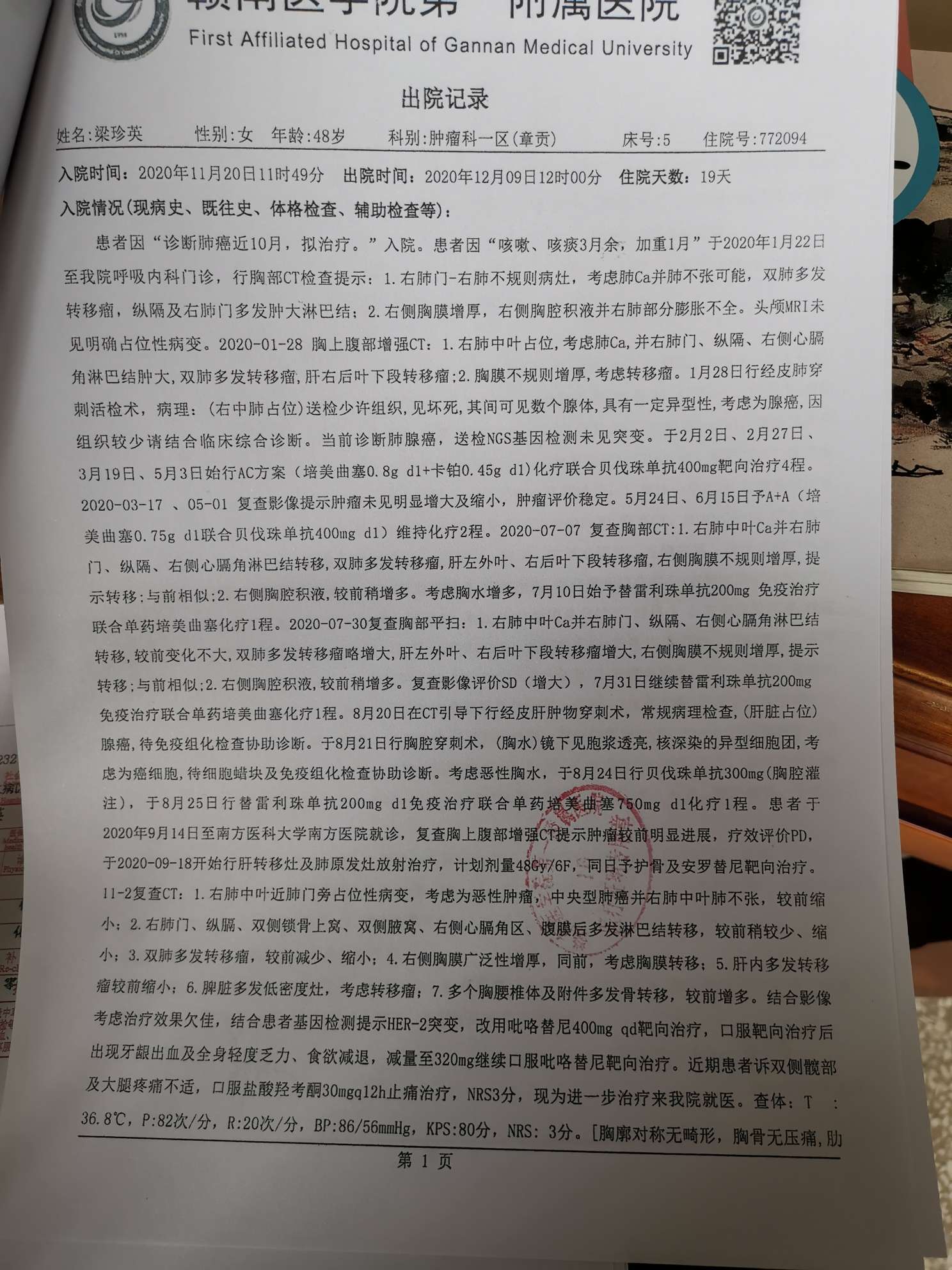 妈妈患肺癌已经有三年了,这三年来一直在接受治疗到现在,下面是妈妈检查以及治疗的过程。2010年10月,妈妈体检出肺癌IV期,纵隔淋巴转移,肝部转移,去省肿瘤医院复查,做了PET-CT,结果一样,省肿瘤