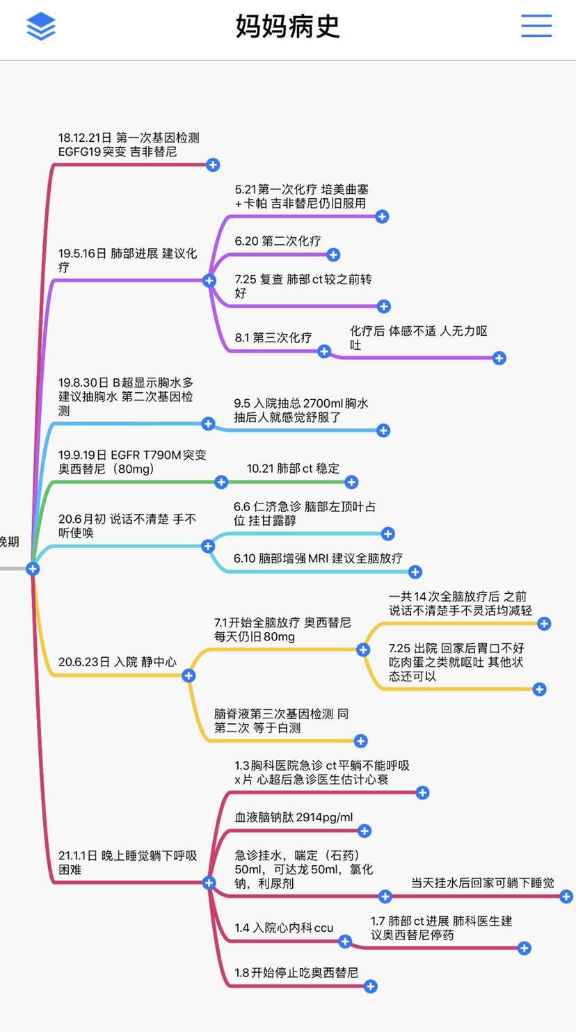 我问她我有看各种报道,奥西替尼耐药后别怕,还有好多个后续治疗方案,但是她也告诉我她们没药,说网络上说的有用那要医生干嘛?说只有化疗,但是我妈妈心脏的情况是受不了的。我妈妈现在已经停奥西替尼整整14天了,心脏问题在中山医院医生帮助下舒服很多,可是本身肺的问题现在等于什么药都用不上,之前脑部转移至少还有放疗,可是现在竟然什么办法都没了。