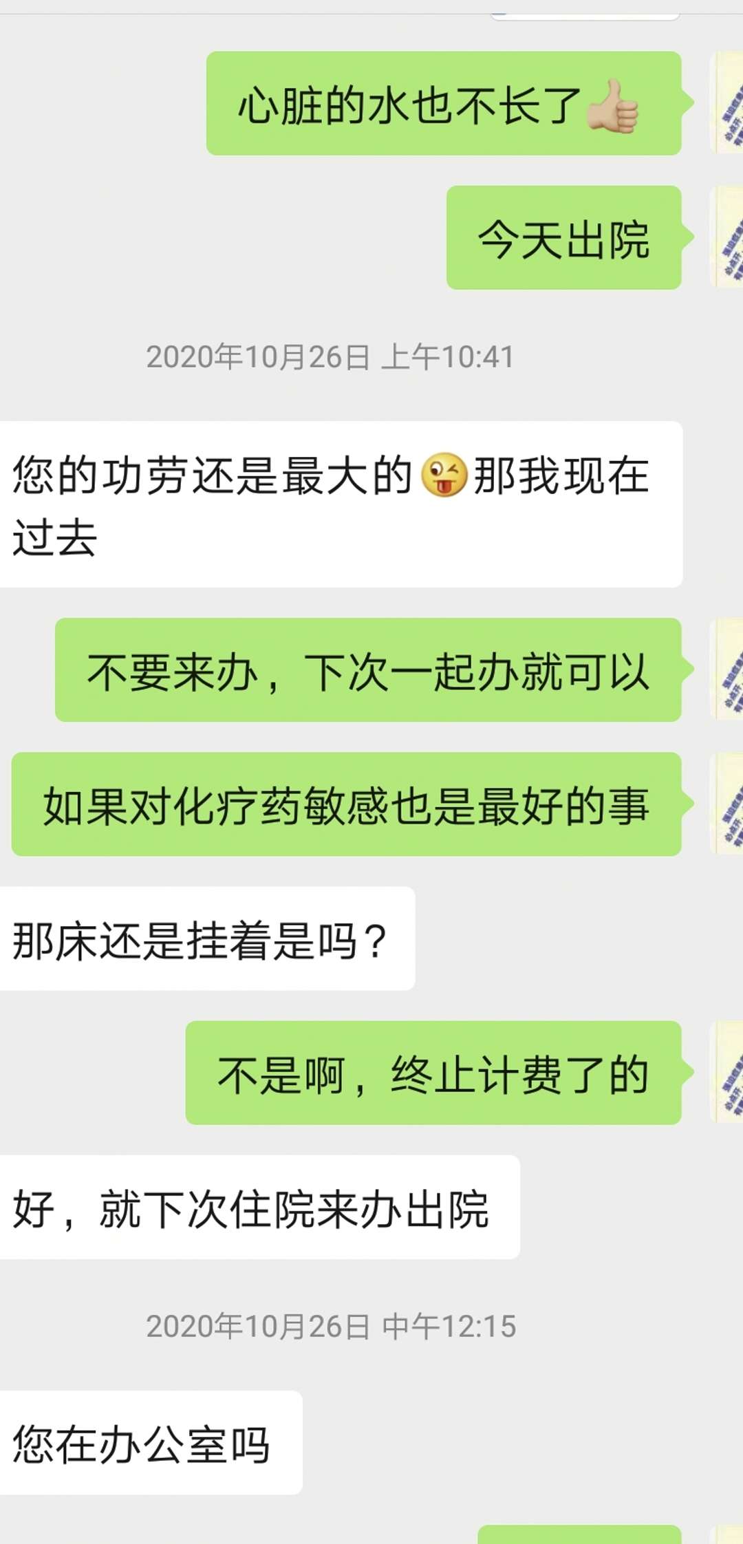 心包积液比较多,中山医院穿刺放水(其实是放血)600ml的血放出后,她的呼吸更加好一些了,带着那个穿刺的袋子出院回家,以为可以到胸科医院继续看肺的问题,但是帮她看了两年病的医生说后续没有办法了,心好凉!