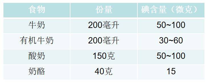 海藻类食物是碘的天然来源,不同的海藻由于种类、生长地区和加工方式不同含碘量也不同,其中海带的含碘量最高。1片海带碘含量就高达2984 微克,是每日推荐摄入量的近30倍。裙带菜的碘含量约为66微克,是每日推荐摄入量的44%。紫菜的碘含量在16~43 微克之间,是每日推荐摄入量的11~29%。牛奶和其他乳制品也是人们在日常生活中获得碘的重要途径。牛奶中碘含量高的主要原因有两个:一个是奶牛饲料中碘含量高;另一个是在挤奶过程中使用含碘消毒剂,而有机牛奶的碘含量比普通牛奶低约四成。一杯牛奶基本上就能满足一个健康成人一天所需的碘。