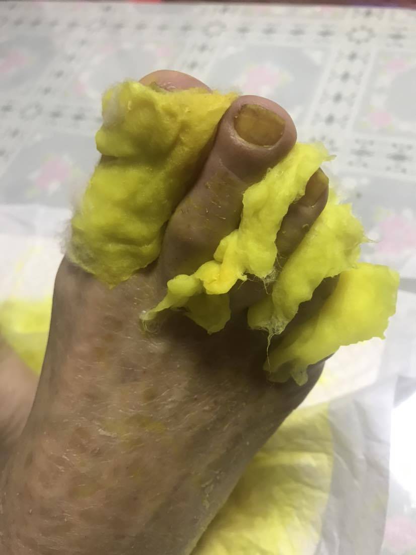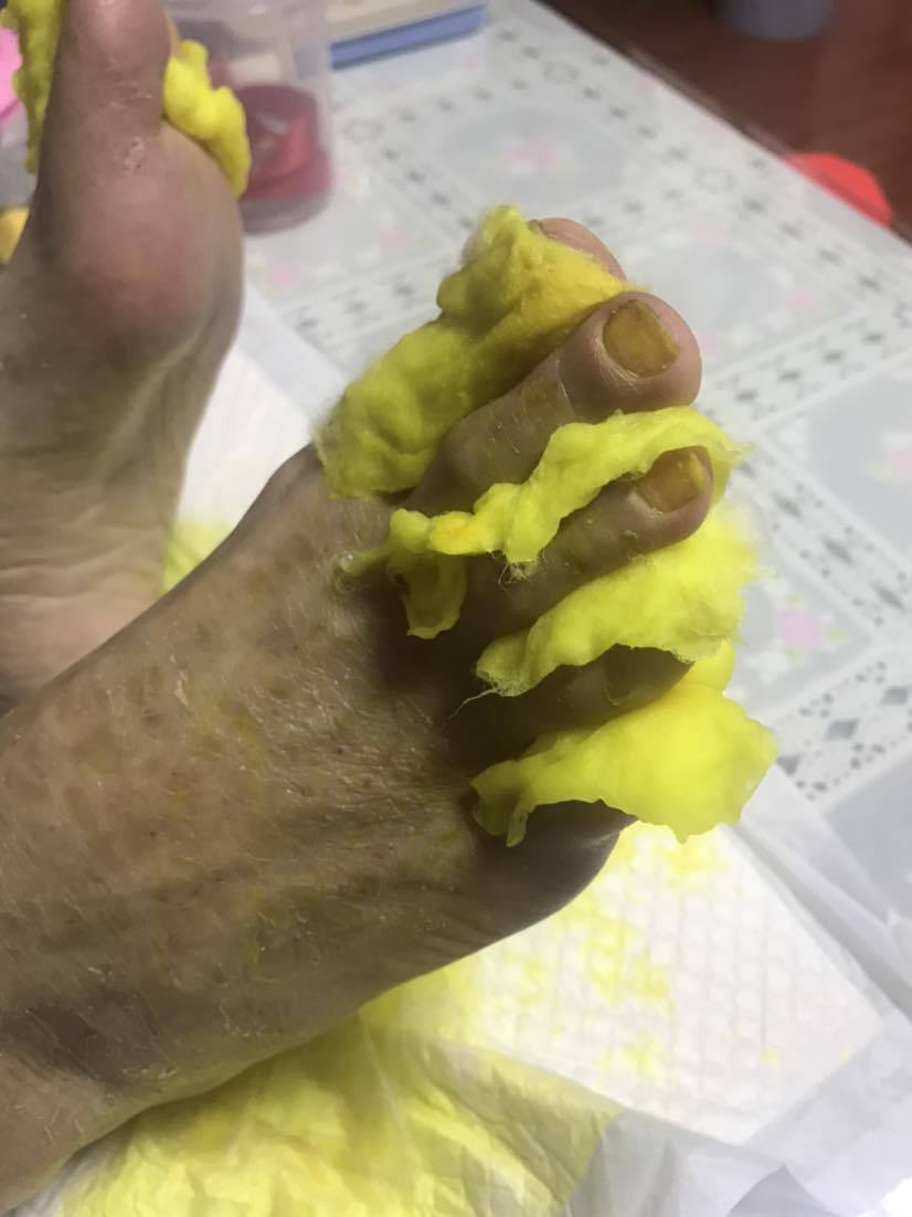 最近老妈脚都不敢下地 2只脚指甲旁边全部 发炎 红肿 血痂 还流脓水 看着真是可怜呐!!!继续 黄连素水敷起来