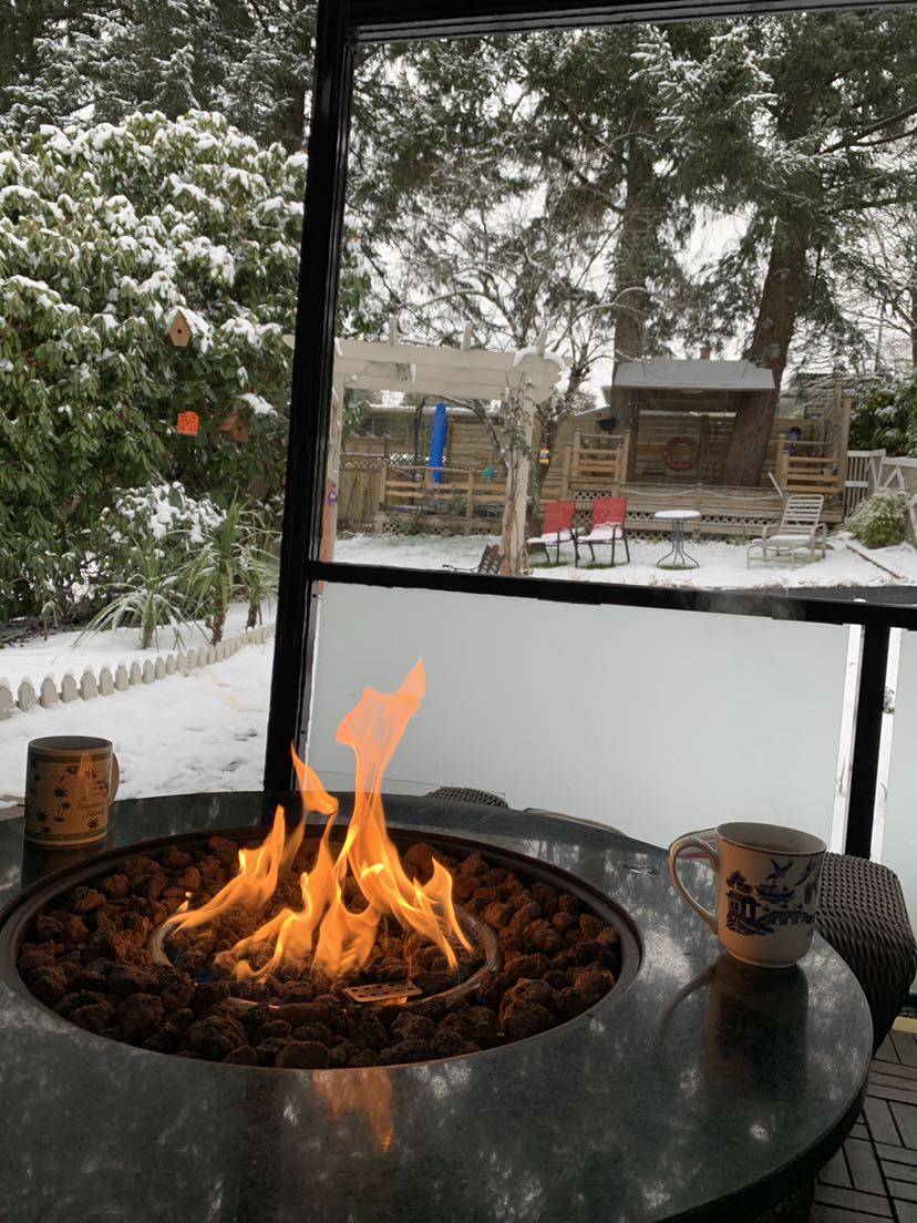 东西(衣服)买完了,到家了,现在雪还在下,喝茶赏雪。