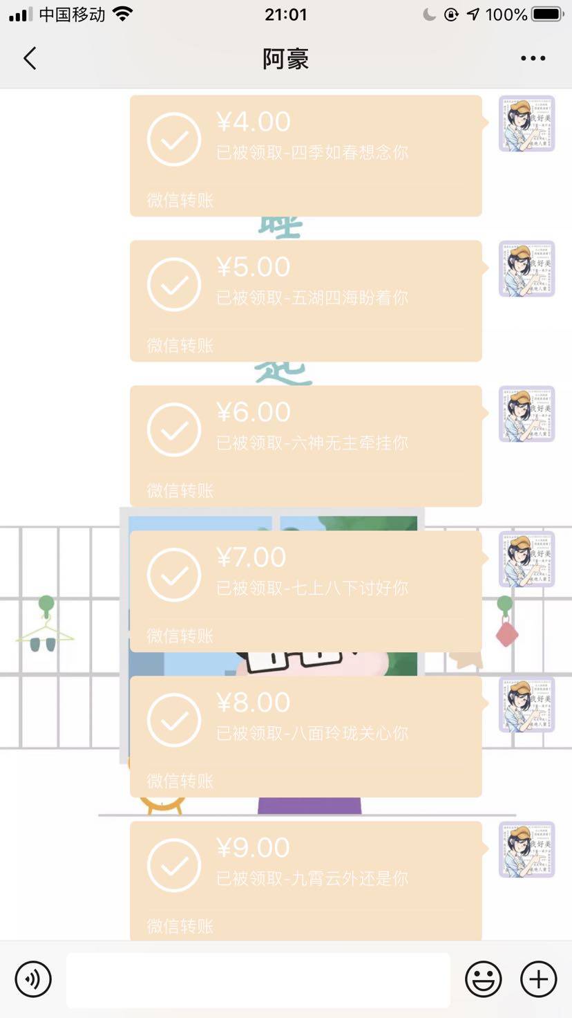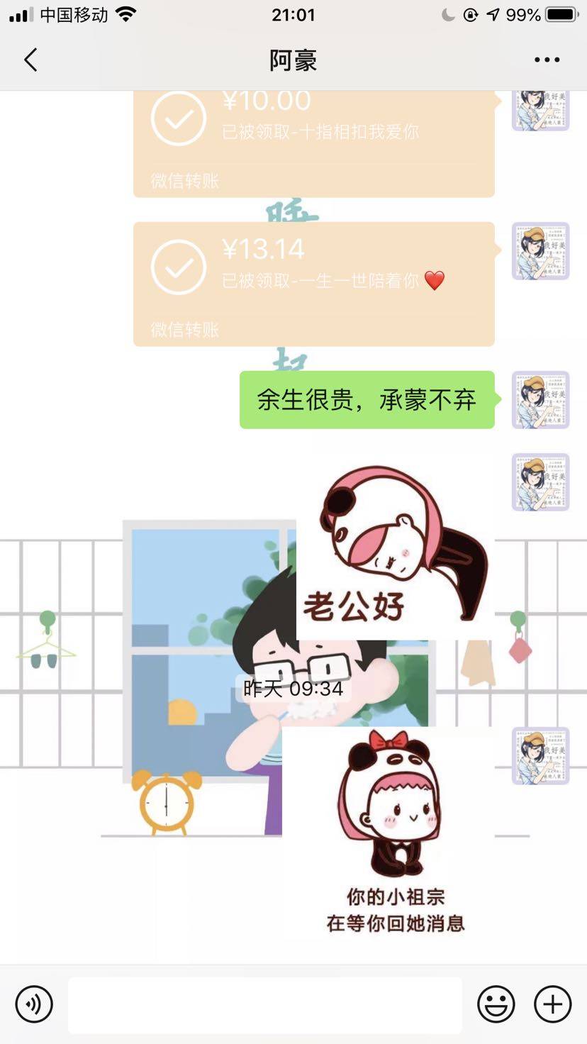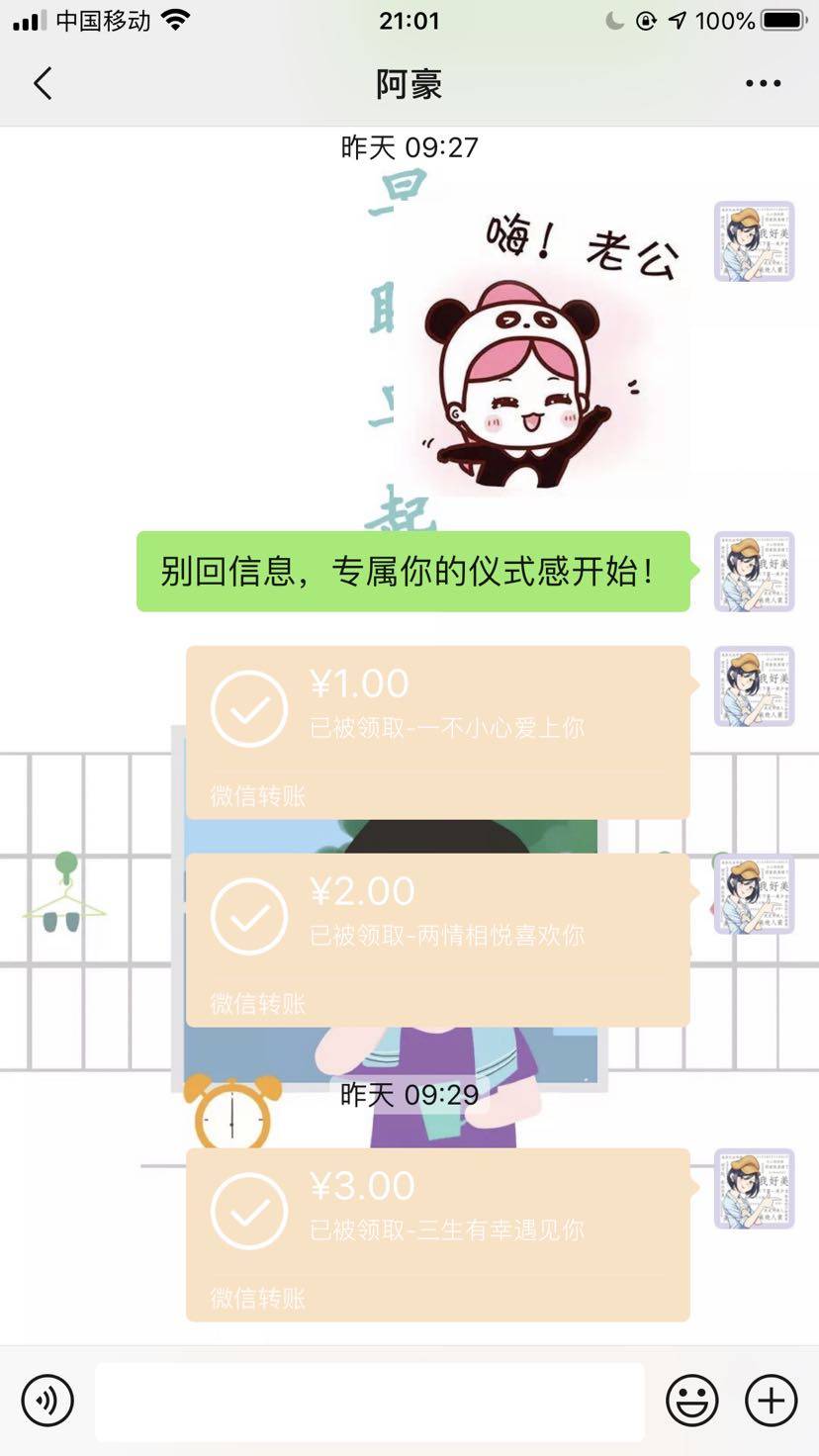 虽然没过,但是刷抖音时看到转账的,感觉没便宜外面,有个仪式感也不错,立马给老公安排上,把他感动的稀里哗啦。我真是个天才!最后劝下姐妹,想开点,与其将惊喜寄托在别人身上,不如自己掌握主动权。不被商家牵着走,做生活的主人😄
