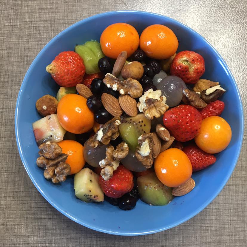 喜庆吧哈哈😄水果坚果拼盘:草莓🍓猕猴桃🥝金桔🍊蓝莓桂圆,无花果,核桃仁和杏仁,饭后一个小时后再吃。放冰箱里冷藏,潮热劲一上来吃一口美极了!