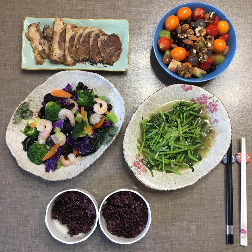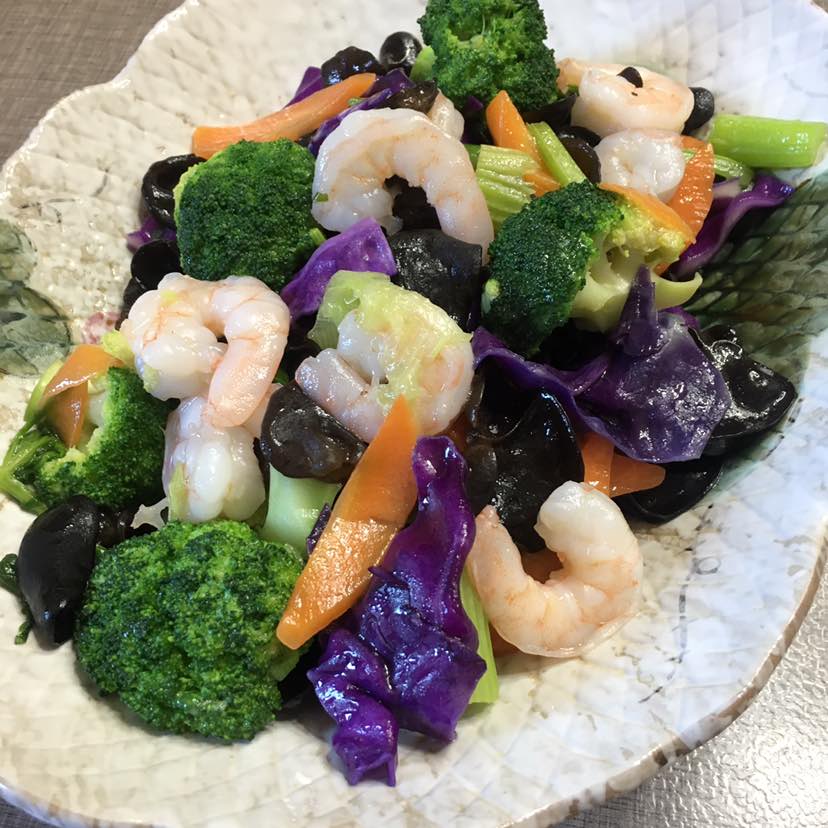 炒杂蔬,西兰花,紫甘蓝,虾仁🍤和西芹,还有黑木耳和胡萝卜🥕这道菜看起来颜值还是很高的😄而且种类繁多,一道菜就可以解决一天所需的维生素和膳食纤维。
