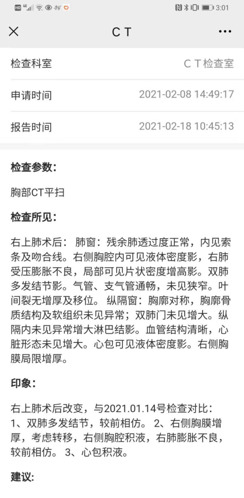 301主治医生在两个月前让我们吃上了二代药阿法替尼,一个月复查时有明显改善,多发结节减少,胸腔积液大幅减少。于是从第二个月开始联合贝伐单抗及培美曲塞单药,四个疗程,强化治疗。查过大量文献和临床研究,综合治疗(A+T,T+化疗)也一直是我自己所主张的方向。